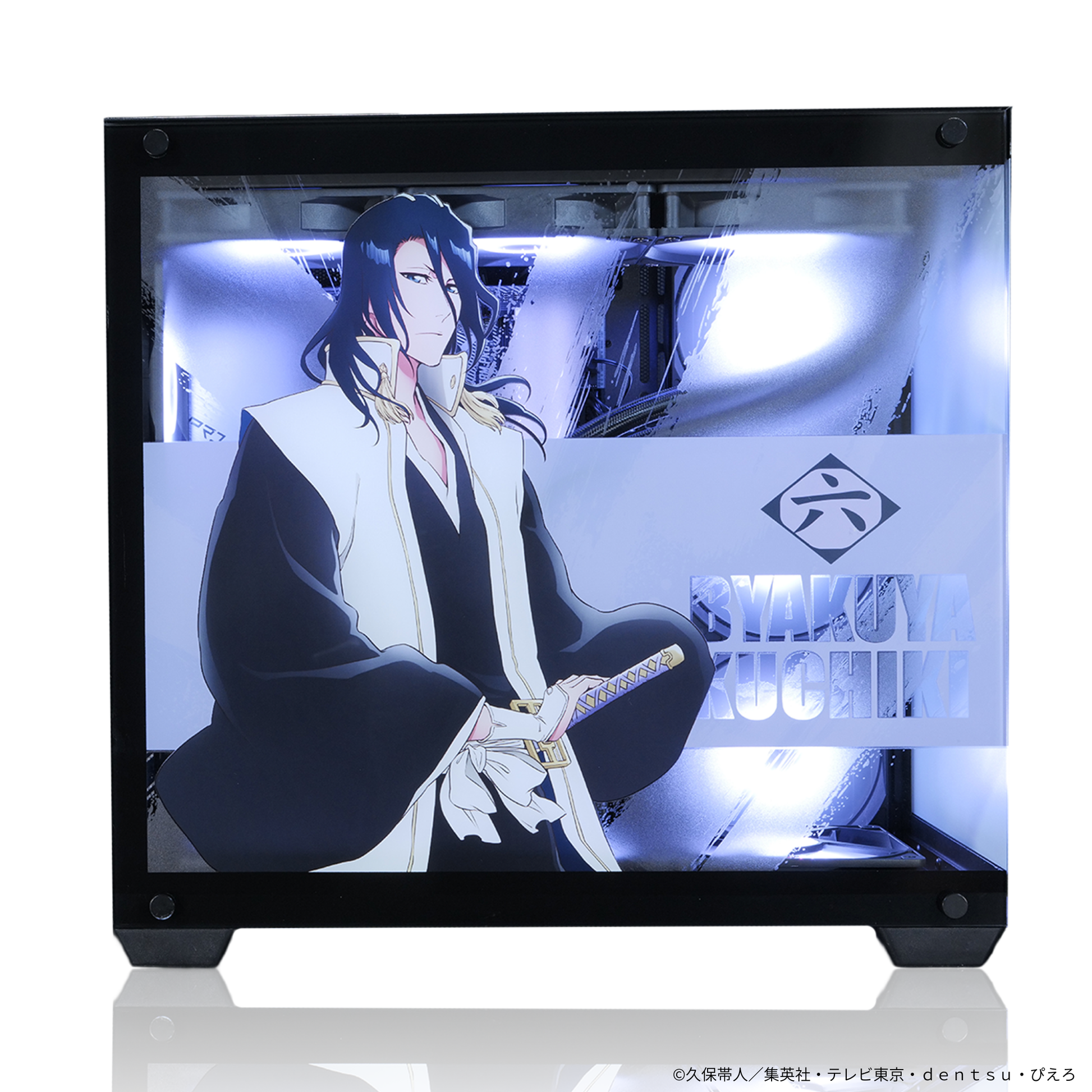 別途、弊社にてご購入をいただいたPC本体の4面パネル(フロントガラス、サイドガラスパネル、サイドバックパネル、トップメッシュフィルター)を交換する事で、朽木白哉仕様へのモデルチェンジが可能となります。