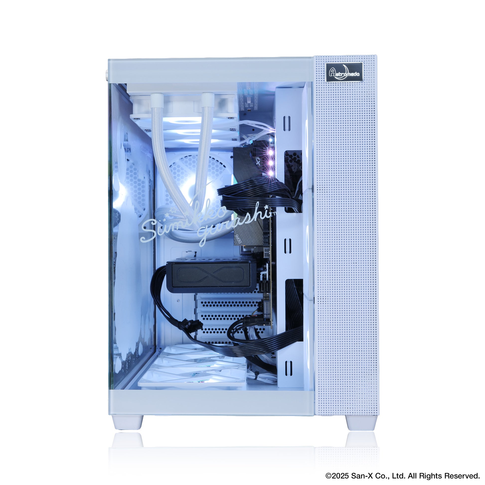 PC筐体のサイドガラスパネル面には、すみっコたちの愛らしいイラストを丁寧にプリント。